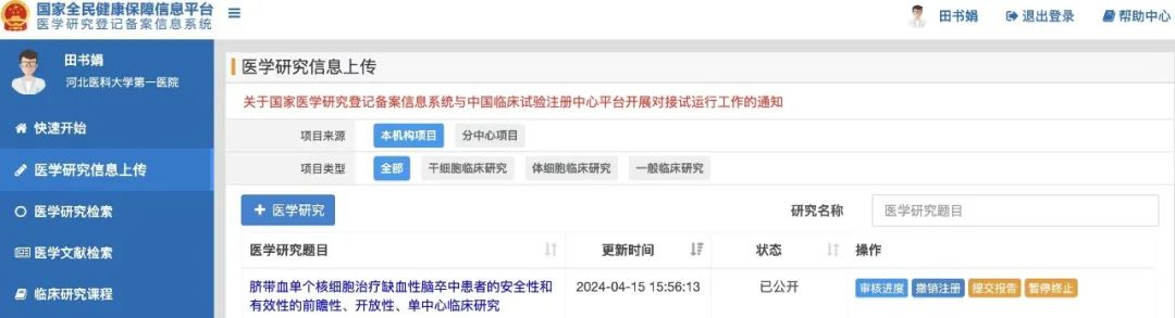 2024年4月25日,河北银丰鼎诚生物技术有限公司(以下简称:银丰生物集团河北公司)与河北医科大学第一医院•首都医科大学宣武医院河北医院(以下简称:医大一院)合作的脐带血单个核细胞治疗脑卒中临床研究正式备案成功!该项目由医院神经内科田书娟教授牵头开展,旨在评价脐带血单个核细胞治疗缺血性脑卒中的安全性和有效性。