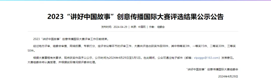 “讲好中国故事”创意传播大赛是以“讲好新时代中国故事”为宗旨,面向国内外社会公众公开征集各领域中国故事、传播中国好声音、树立中国良好国际形象的年度官方品牌活动。大赛自2017年启动以来,已成功举办六届。2023年,先后在温州、重庆、山东、长沙、吉林、湖北、广西、四川、海南启动了9个地方分站赛,同时举办中医药主题赛,征集作品约5000件,通过线上专家评分和全国网络投票共有98件作品提交全国定评会议评审,最终评选产生本届大赛特等奖和一、二、三等奖入选作品。